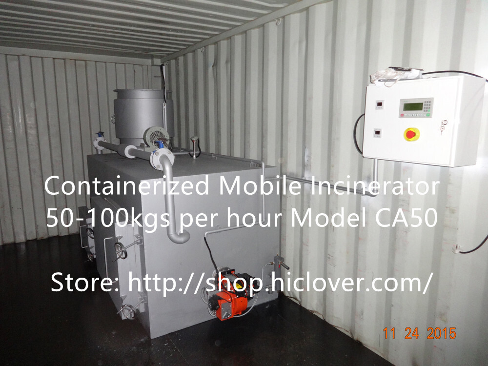 The mobile incinerator mounted in ISO container before leave factory, pre-installation, no incineration house build construction, movable by truck and ultraviolet lamp sterilization inside.